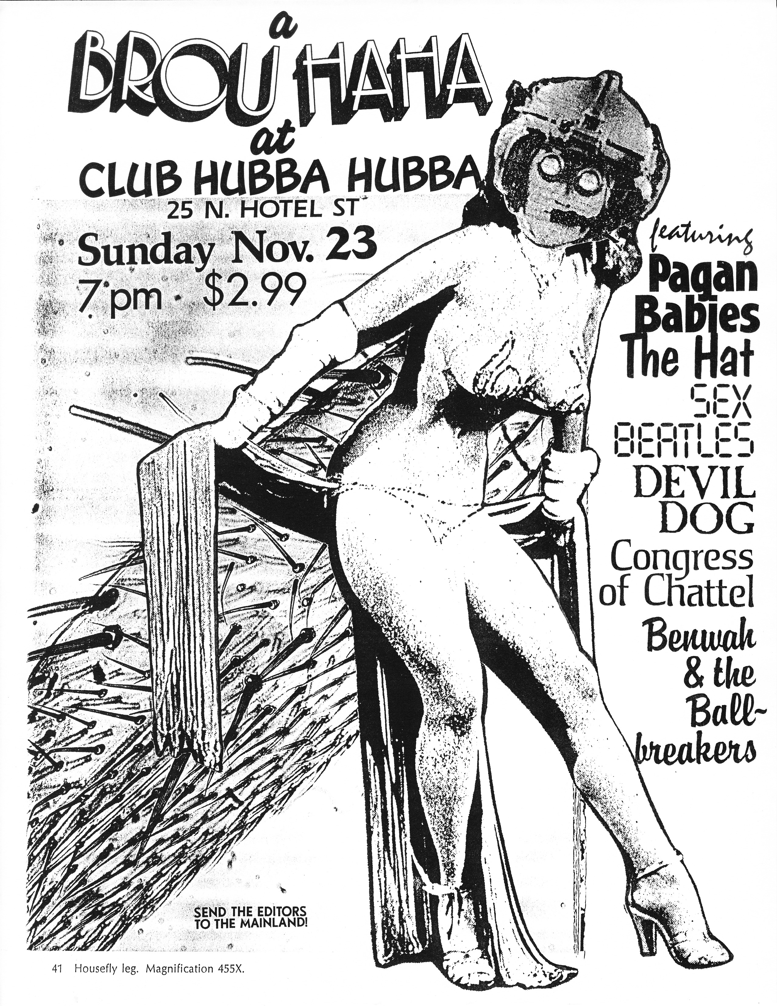 I was underage. Normally, I wouldn’t have been allowed in (some might argue otherwise), but this was a special occasion: a live, loud and raucous music bash for the infamous Brouhaha fanzine was taking place. Of all the local ‘zines that were passed around at the time, none had quite the reach or influence of Brouhaha and few could command such a riveting lineup of Hat Makes the Man, Pagan Babies, Devil Dog, Sex Beatles, Congress of Chattel and Benwah and the Ballbreakers.