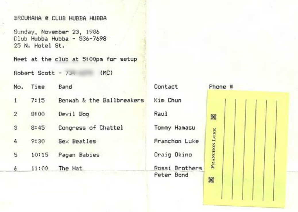 It’s a sentiment echoed by Gary Chun, a scene veteran and voracious consumer of music. By the time he’d crossed paths with Lum in the early ‘80s, he had already caught several now-iconic bands of the new wave, long before most had even heard of them. In 1979, Talking Heads, though far from a household name, had just experienced a spike in popularity through national spins of “Take Me to the River” and were brought in to play Little Orphan Annie’s, an airport-area watering hole just a stone’s throw from Hickam Air Force Base and Pearl Harbor. This was followed by an historic, though under-advertised show by the up-and-coming B-52s, only months later. As Chun recalls, the tiny B-52s crowd at Annie’s was “just a bunch of us, all up front, who knew of the band — a very small number. I’d be surprised if they got 50 people in attendance. The military guys in the place were just wondering, ‘What the fuck are these guys?’” He shakes his head at the memory. “I’m sorry I don’t remember who promoted those shows, but they had great foresight.”