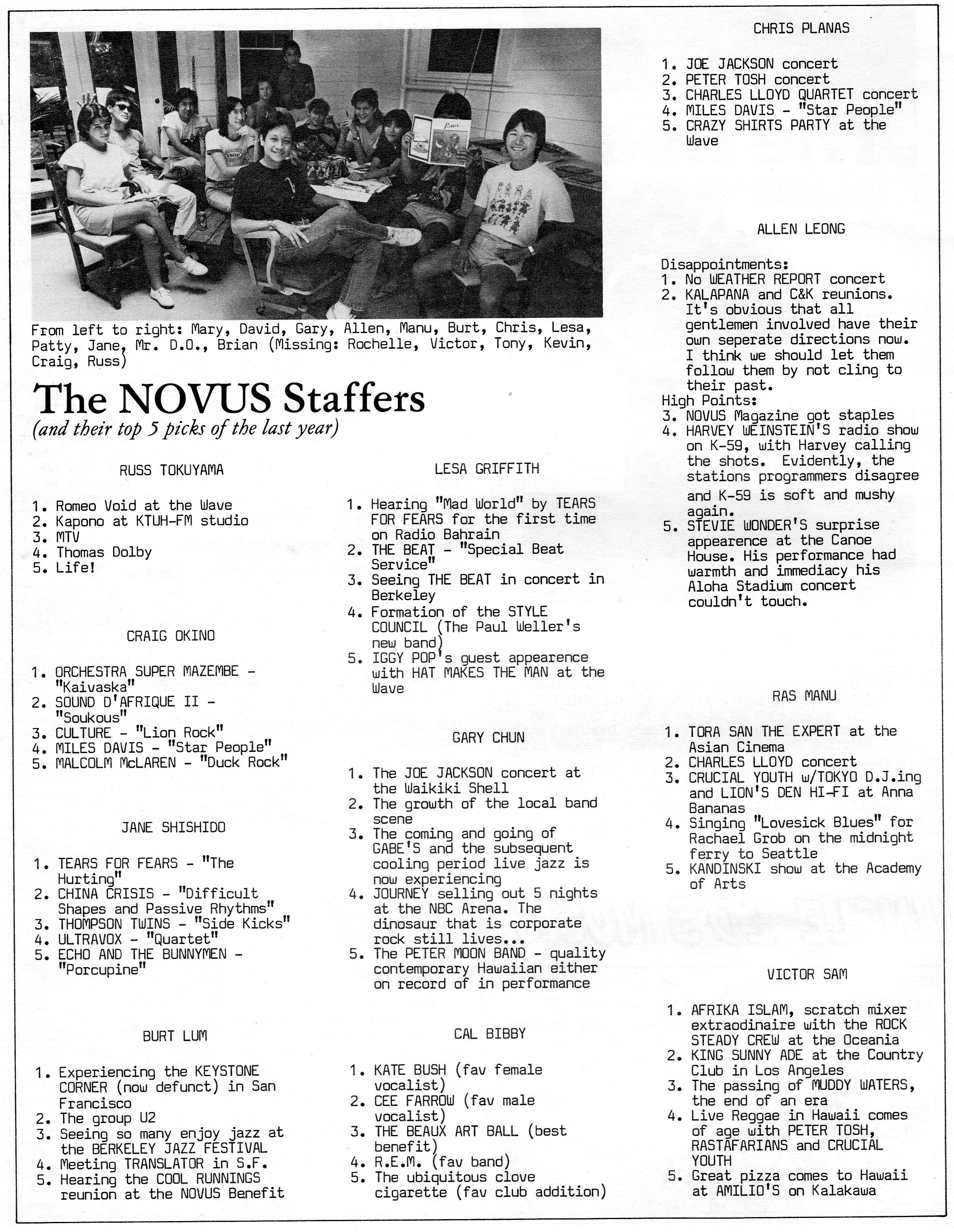 Perhaps it was destiny, but before long, Chun and Lum, eager to report on the growing local scene and the new seismic shift in music, established Novus. When it premiered in the fall of ‘82, hip hop had started to make serious incursions into radio, the British synth-pop invasion was in full swing, Hawaiian music had begun to branch out into new musical territories and reggae’s annexation of the Hawaiian Islands had already taken root. Lum would be editor and Chun associate editor. They soon created a radio show, christened Rough Take, which aired on the University of Hawaii’s KTUH, to promote the magazine and provide an aural component to Novus.