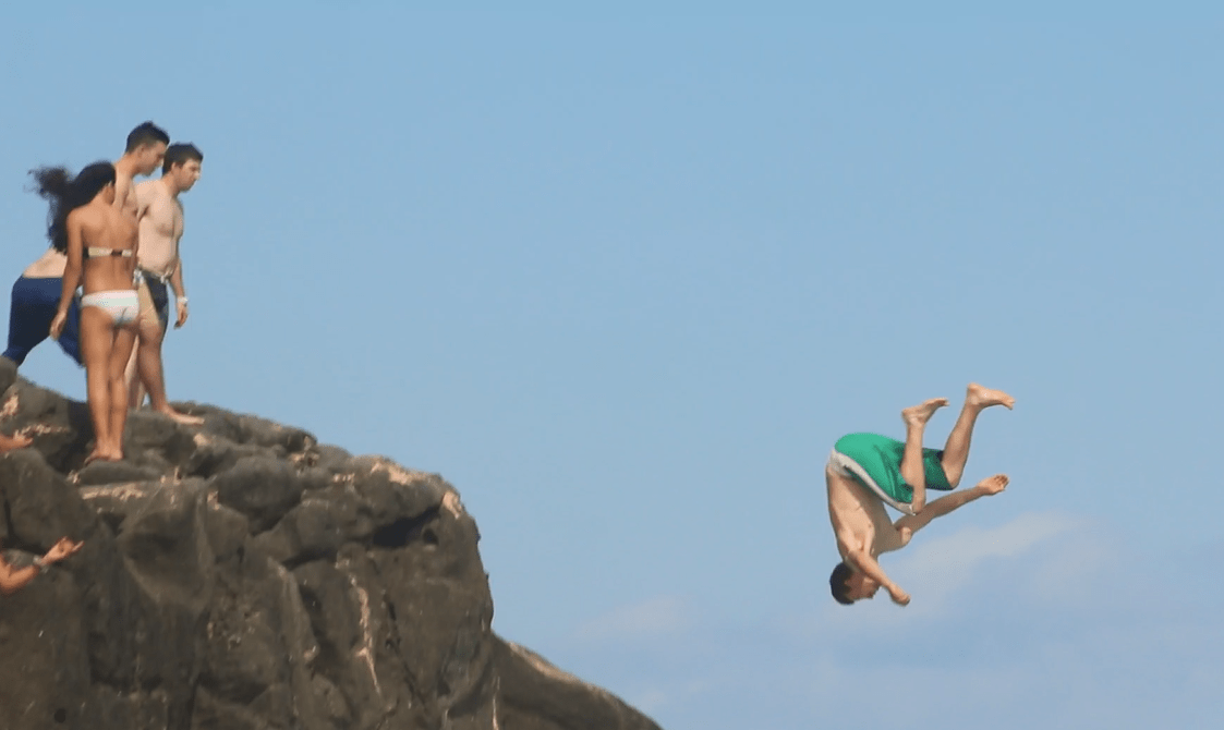 The famous Rock at Waimea Bay Beach Park is a North Shore landmark, drawing countless thrillseeking locals and visitors, both young and young-at-heart, to its peak. Some are seasoned divers, others first time adventurers. Here, smiles and laughter abound, year ’round.