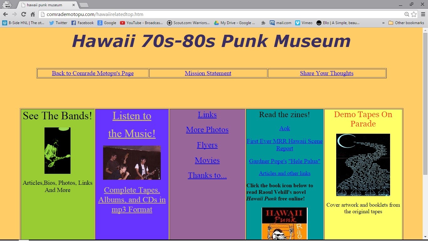 Currently, sound clips to many of these groups’ works can be found on Dave Carr’s Hawaii 70s-80s Punk Museum, the Web’s preeminent source for subversive sounds of the era. Much thanks must be given to Mr. Carr, producer of No Place to Play and a former member of such exalted acts as Cringer, The Wrong, The Vacuum, etc, for allowing his original copy of Your Complete Guide to Hawaii’s Underground to leave his possession temporarily so that I might share it with you here on B-SideHNL.com.